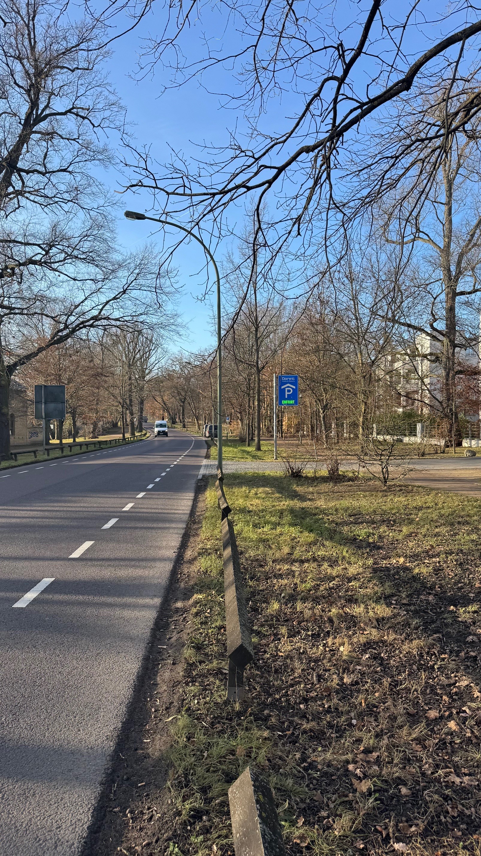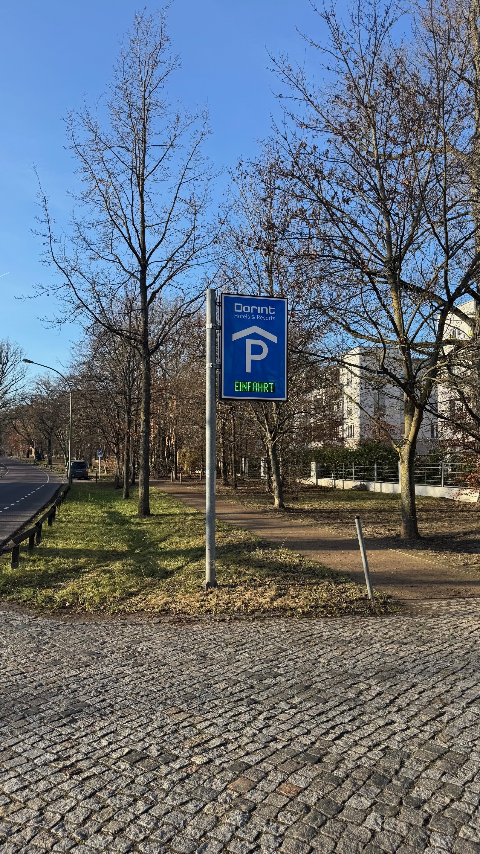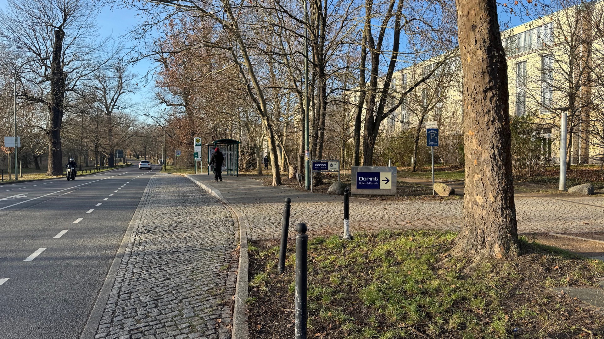Fahren Sie über den Reiterweg oder die Jägerallee in Richtung Dorint Hotel Potsdam. Das Hotel ist gut sichtbar beschildert. Fahren Sie am Hoteleingang vorbei.