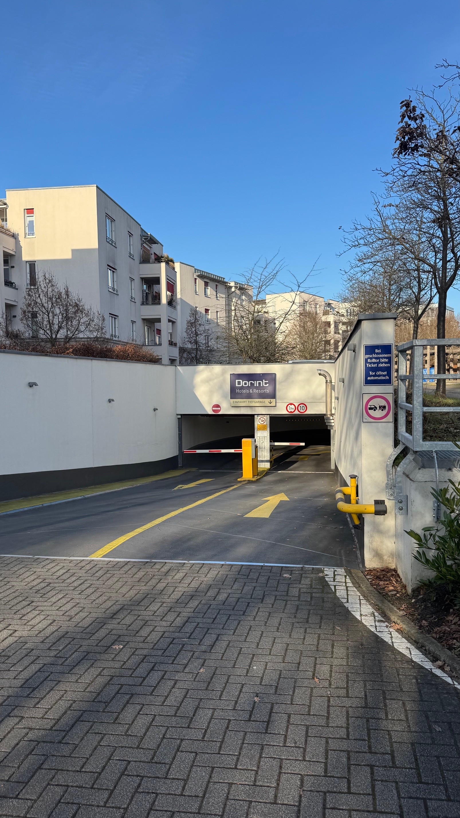 Betätigen Sie den Ticketknopf oder verwenden Sie Ihre Hotelkarte, um die Schranke zu öffnen.